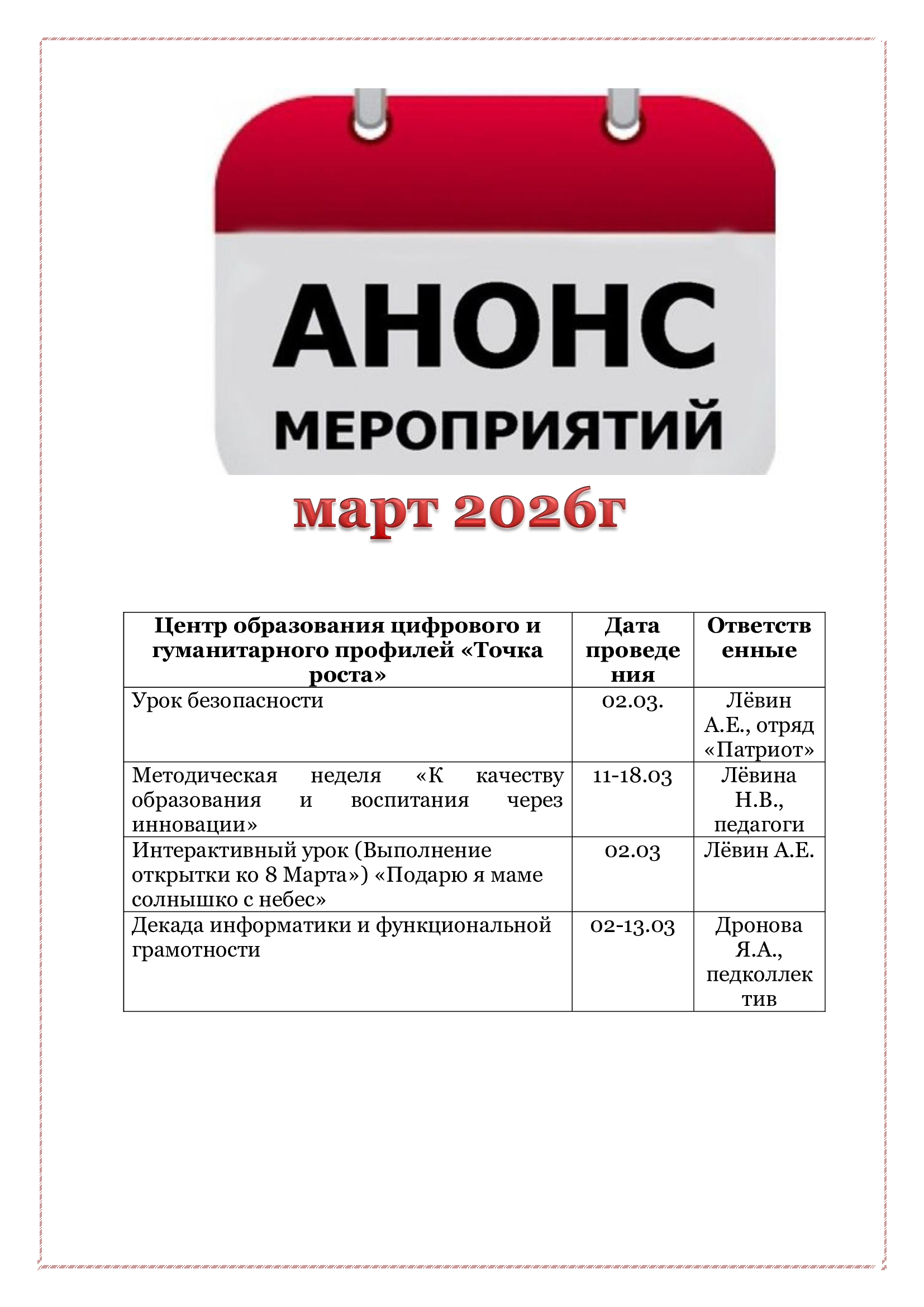 План учебно – воспитательных, внеурочных и социокультурных мероприятий центра образования цифрового и гуманитарного профилей «Точка роста» МБОУ «Фатневская средняя общеобразовательная школа имени Героя Советского Союза Семена Матвеевича Сидоркова» на 2025-2026 учебный год